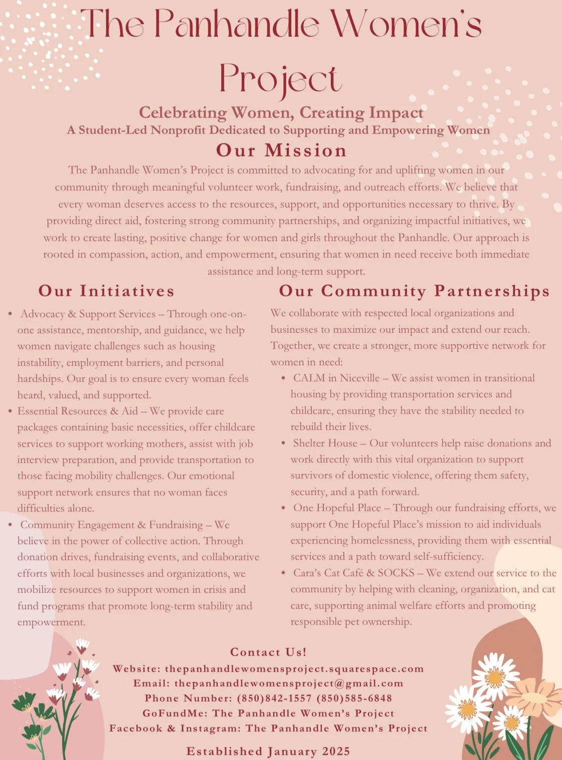 Our mission at the Panhandle Women’s Project is to uplift and empower women by fostering a community rooted in support, compassion, and opportunity. Founded by two high school juniors from Niceville, Florida, who share a deep passion for women’s rights and equality, we are driven by our own experiences as young women determined to make a difference. Through student led initiatives, we aim to inspire confidence, celebrate women’s achievements, and provide resources that uplift, support, and advocate for women in our community. Together, we strive to create a future where every woman feels valued, heard, and empowered to thrive.
